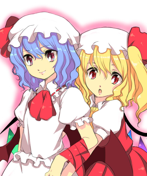 :o2girlsascotcrystaldressfemale focushatlooking at viewermob capmultiple girlsparted lipspuffy short sleevespuffy sleevesred dressred eyesshort sleevessiblingssimple backgroundsisterswhite backgroundwings