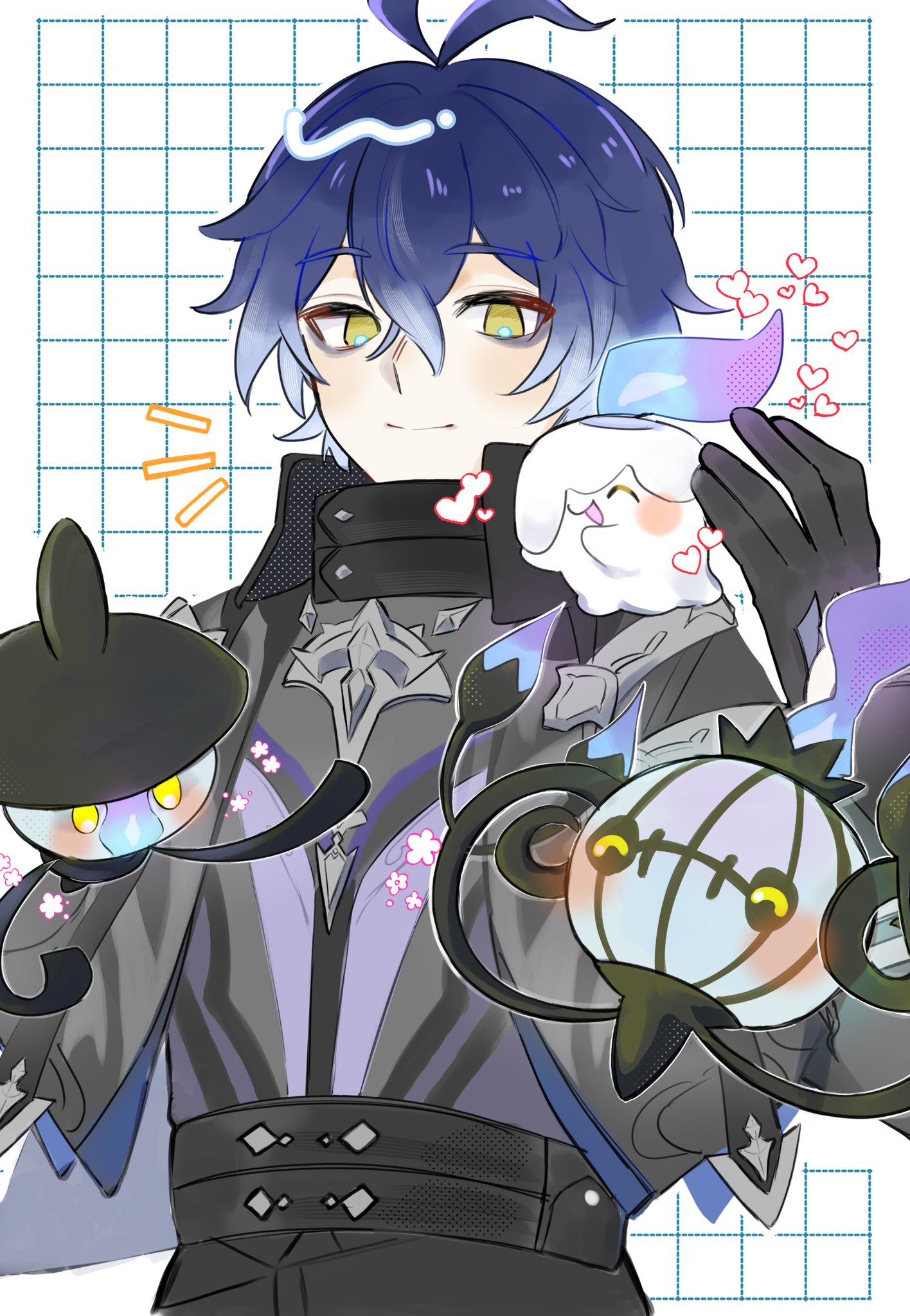 reze (chainsaw man), chainsaw man, absurdres, highres, 1girl, armpit crease, black choker, black ribbon, blue hair, breasts, choker, collared shirt, green eyes, grenade pin, hair between eyes, large breasts, looking at viewer, meowlin, neck ribbon, parted lips, ribbon, shirt, shirt tucked in, simple background, solo, white background, white shirt