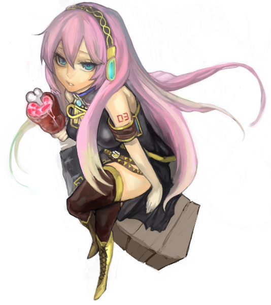 blue eyesboned meatbootsbrown bootscrossed legsfoodheadphoneslong hairmeatnumber tattoopink hairshoulder tattoosittingsolotattoothighhighs