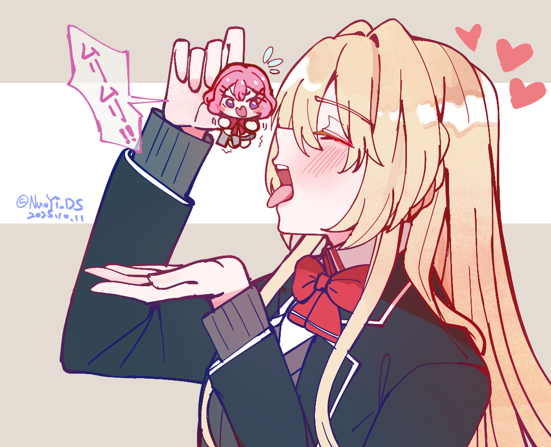 2girlsartist nameashigaya high school uniformblonde hairblushbowbowtiebreastsclosed eyeseatingflying sweatdropshair intakeshair ornamenthairclipheartholdingholding mini personlong hairmini personminigirlmultiple girlsnuoyi dsopen mouthparallel hairclipspink hairpurple eyesred bowred bowtieschool uniformshirtshort hairspeech bubblewhite shirtx hair ornamentyuri