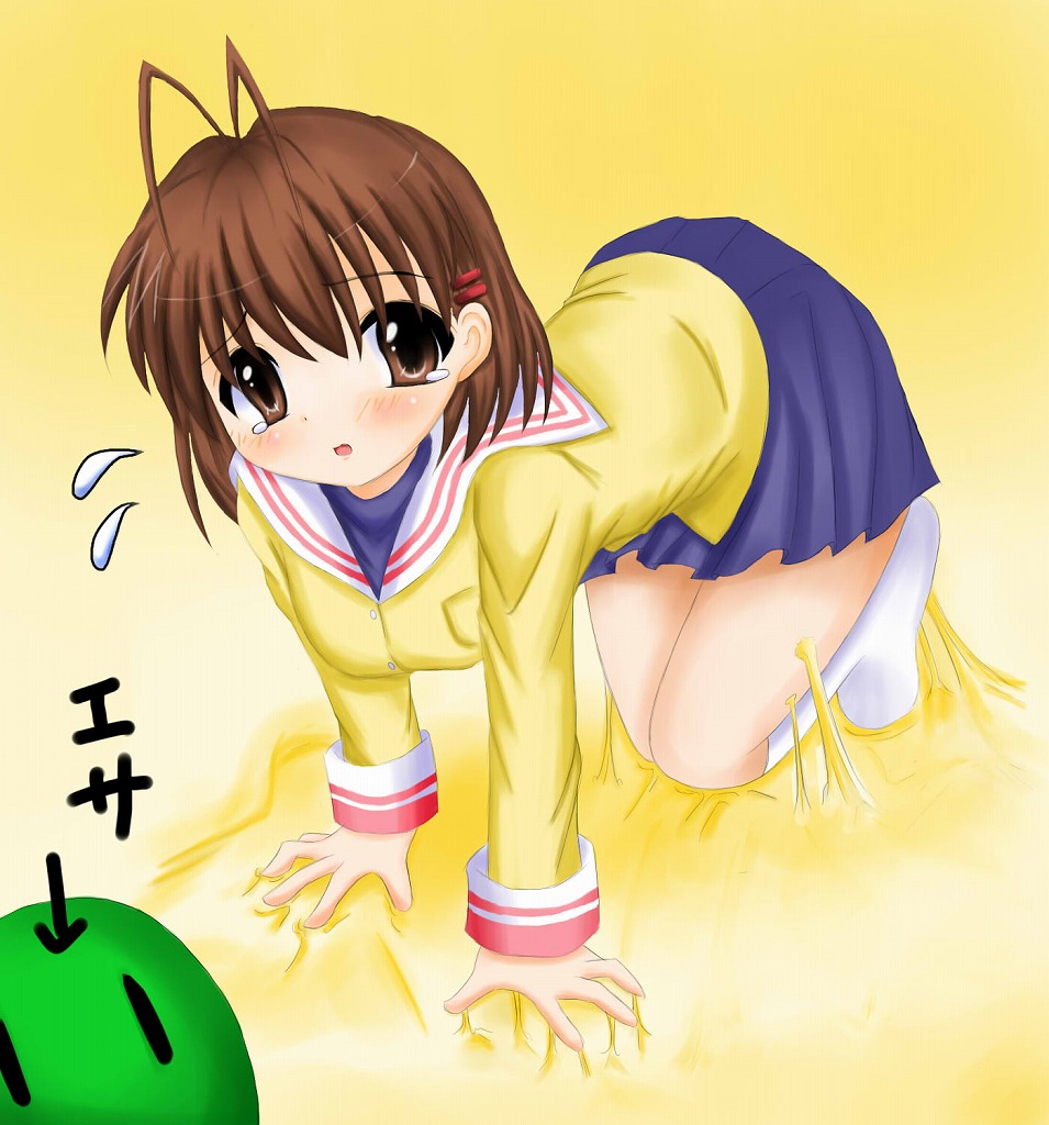onock, highres, black hair, brown eyes, panties, panty pull, school uniform, skirt, solo, underwear, undressing, yellow panties