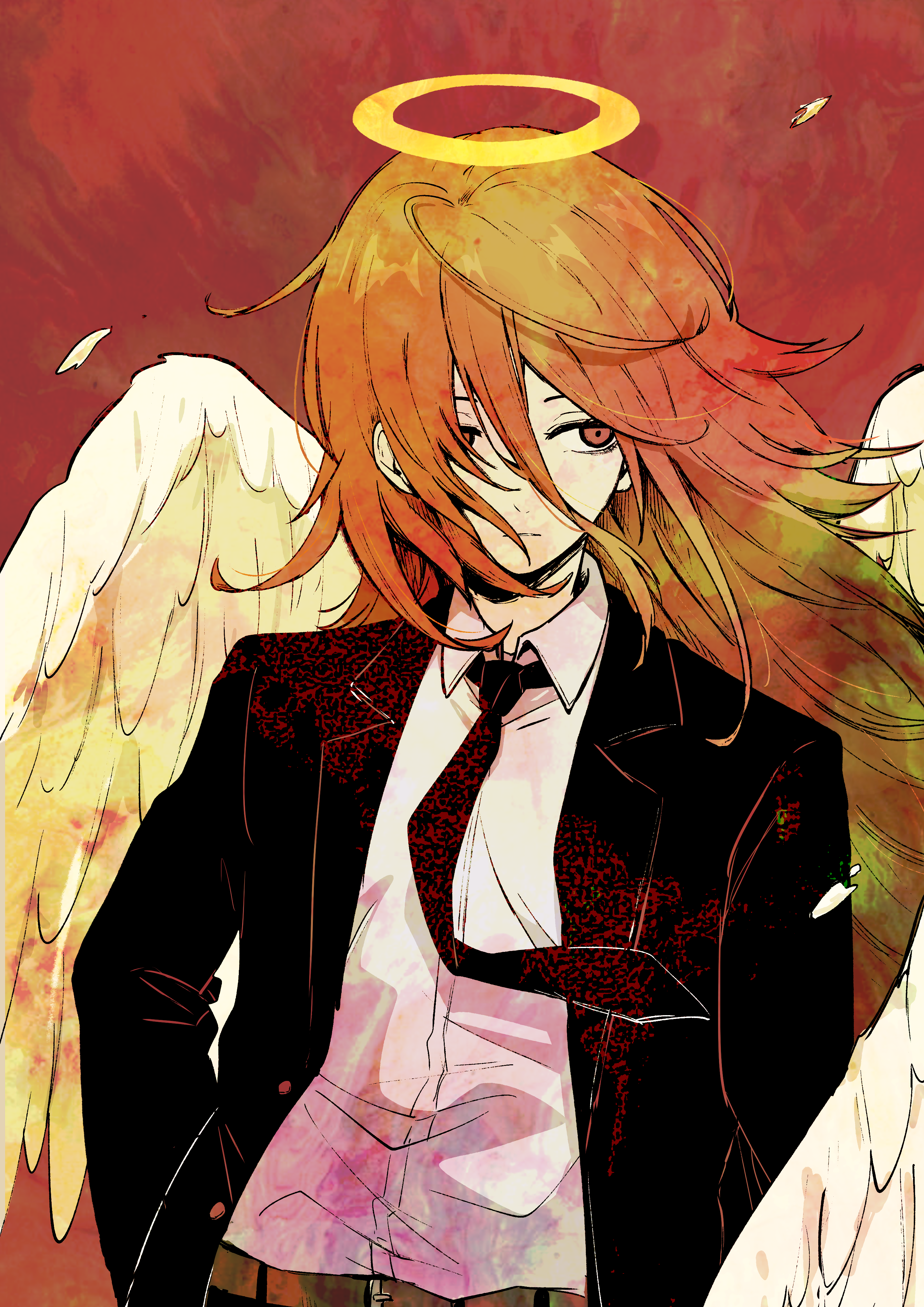 1boyangel wingsblack jacketblack necktieblack suitclosed mouthfeathered wingsformal clotheshalojacketlong hairmale focusnecktiered backgroundred eyesred hairshirtshirt tucked insolosuitwhite shirtwhite wingswingsyellow halo