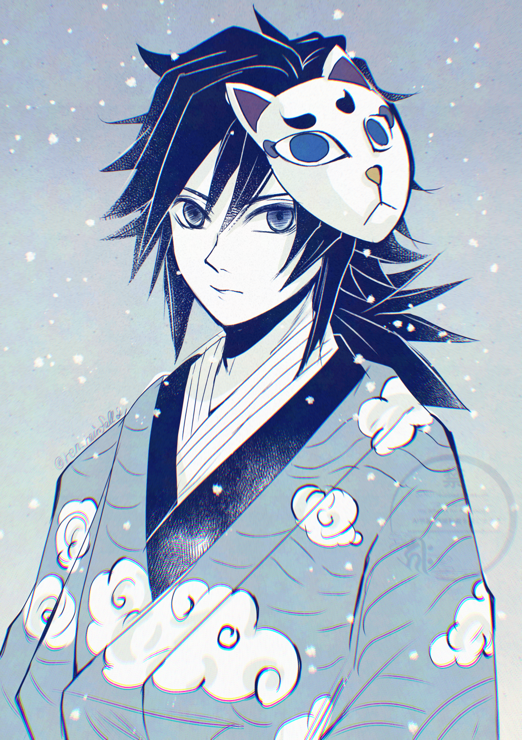1boyalternate costumeblack hairclosed mouthcloud printempty eyesfox maskhair between eyesjapanese clotheskimonolong hairlooking at viewerlow ponytailmale focusmaskmonochromeponytailsnowsoloupper body