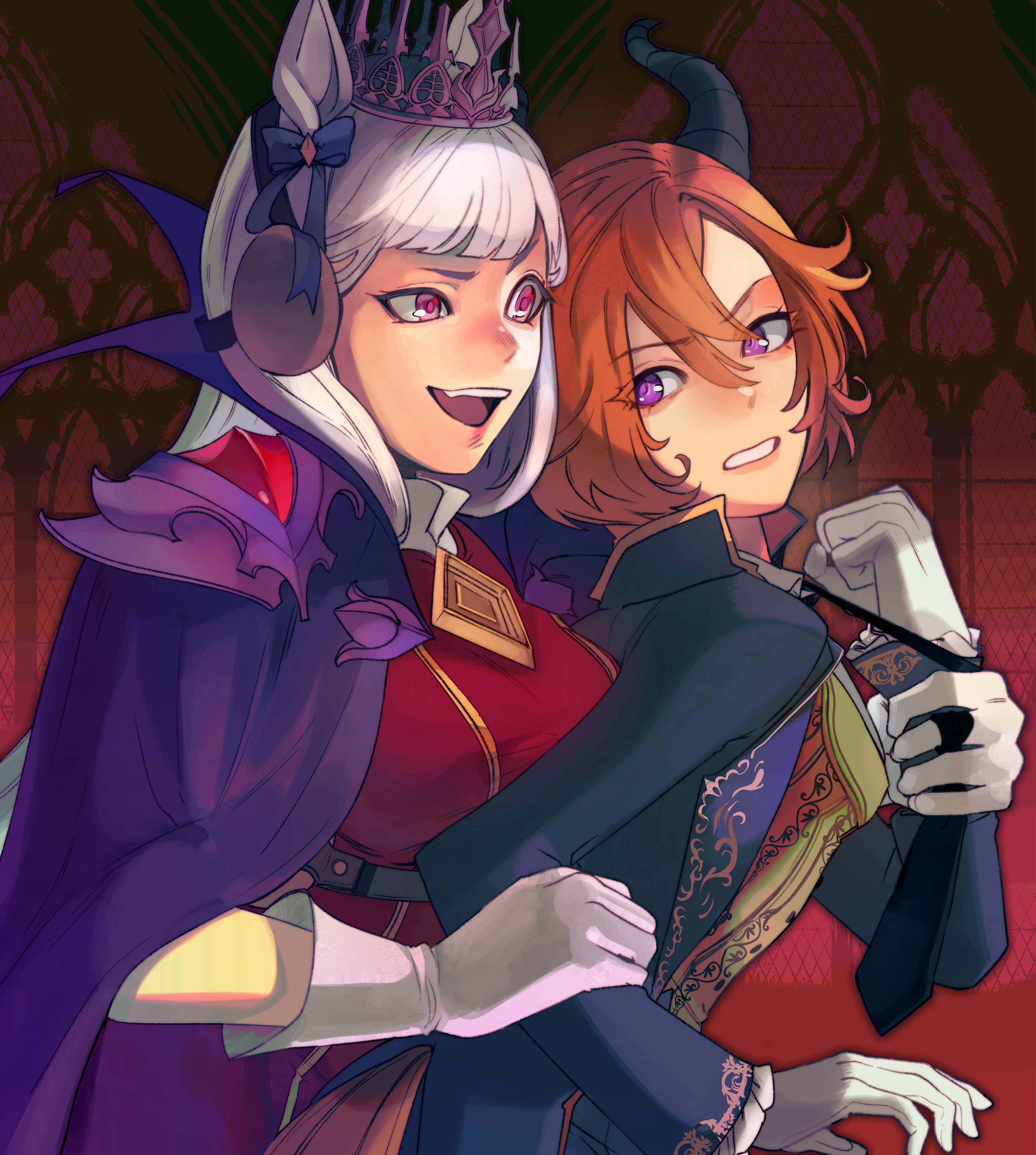 2girlsanimal earsblack capeblunt bangsbowbreastscapecrowndemon hornsdemon taildressear bowear ribbonfangsglovesgrey hairhair between eyeshornshorse earshorse girllarge breastslong hairmultiple girlsofficial alternate costumeopen mouthorange hairpurple bowpurple capepurple eyesred dressshort hairsmiletailteethupper teeth onlywhite gloves