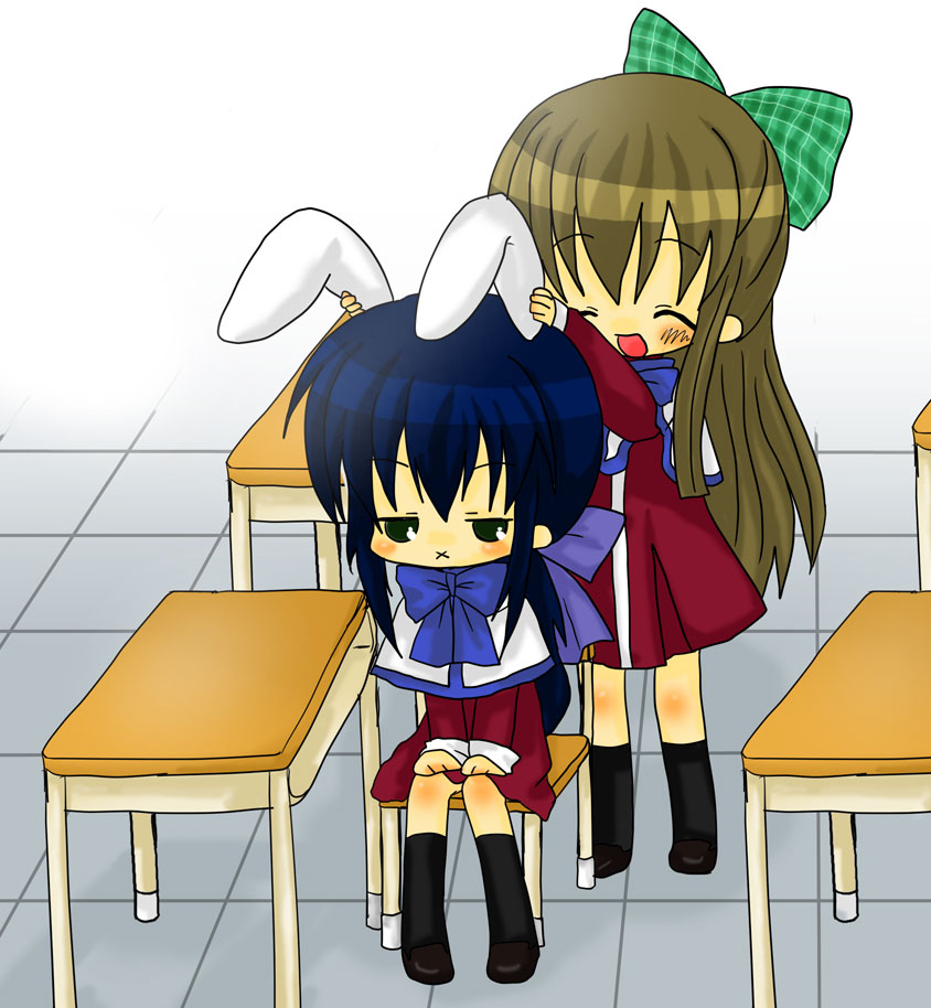 2girlsanimal earsblack eyesblue hairbowbrown hairchairchibidesklong hairmultiple girlsrabbit earsred skirtschool uniformskirtx mouth