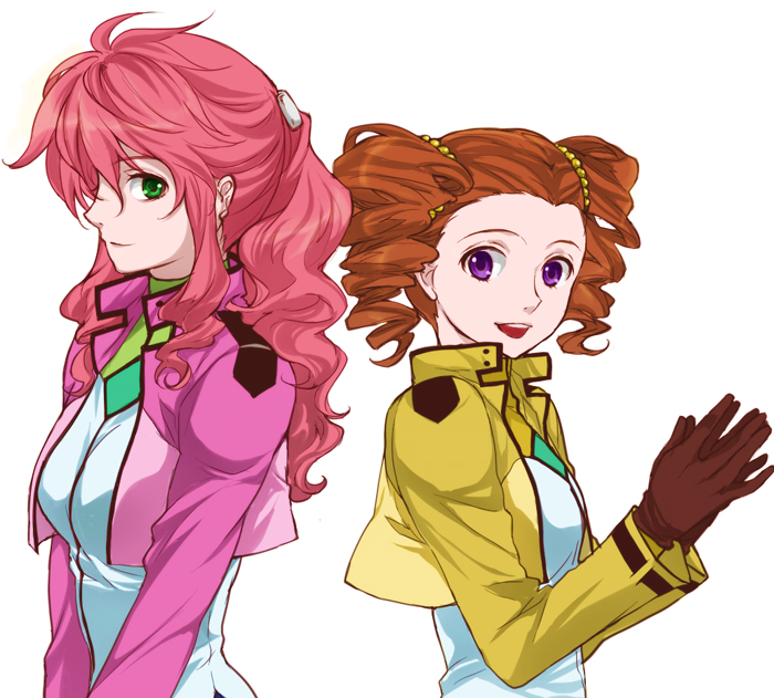 00s2girlsback-to-backbrown haircurly hairglovesgreen eyeshair ornamentjacketmultiple girlspink hairponytailpurple eyessmiletwintails