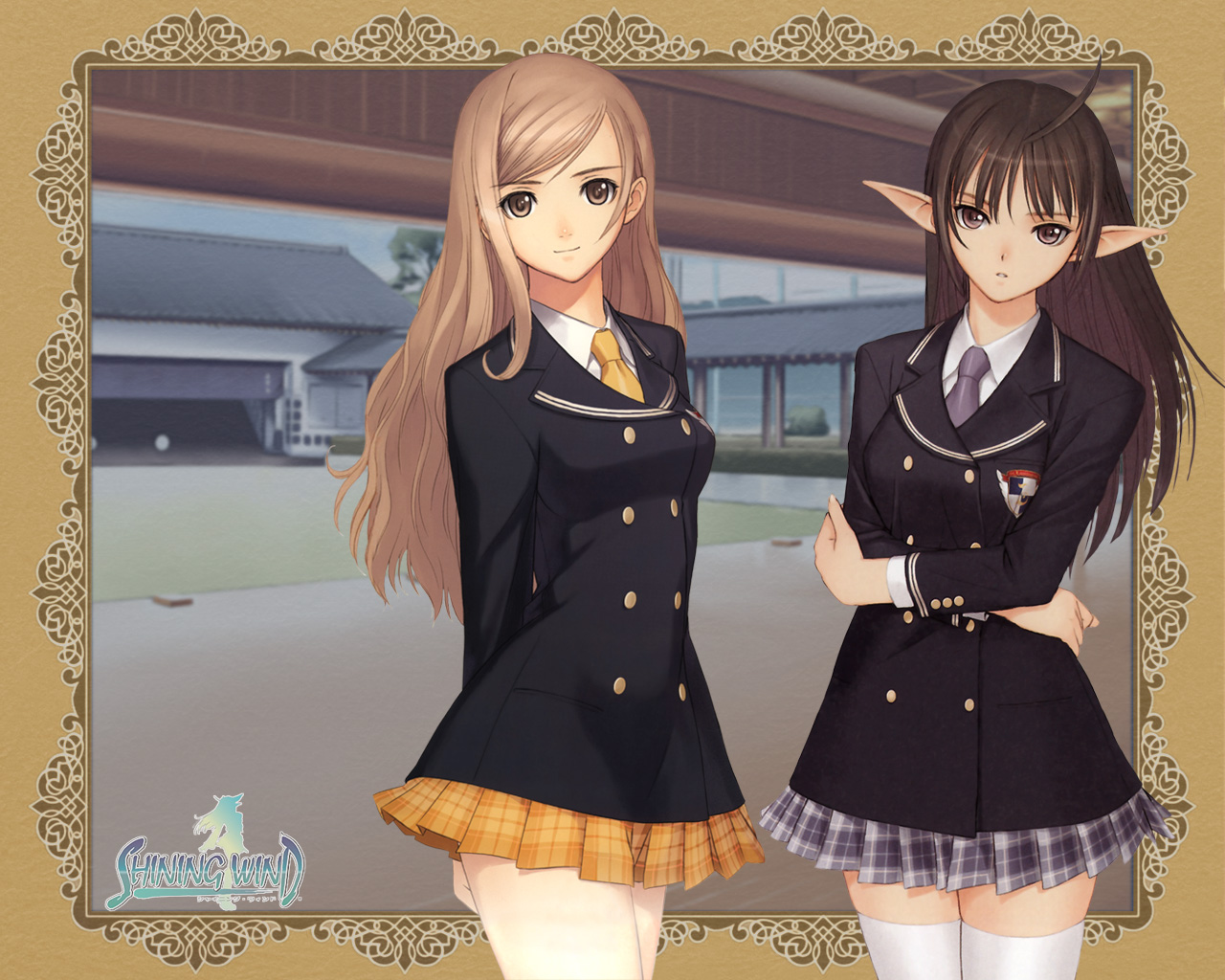 aisaka yunoha (artist), fern (sousou no frieren), frieren, sousou no frieren, absurdres, commentary, english commentary, highres, 2girls, artist name, black jacket, blue flower, bracelet, capelet, closed mouth, collared shirt, earrings, elf, eyelashes, flower, frilled shirt collar, frills, gold trim, grass, green eyes, grey hair, grey shirt, jacket, jewelry, light smile, long hair, long sleeves, lying, multiple girls, on back, on ground, outdoors, parted lips, pointy ears, purple eyes, purple hair, ring, shirt, short eyebrows, striped clothes, striped shirt, twintails, white capelet, yellow flower