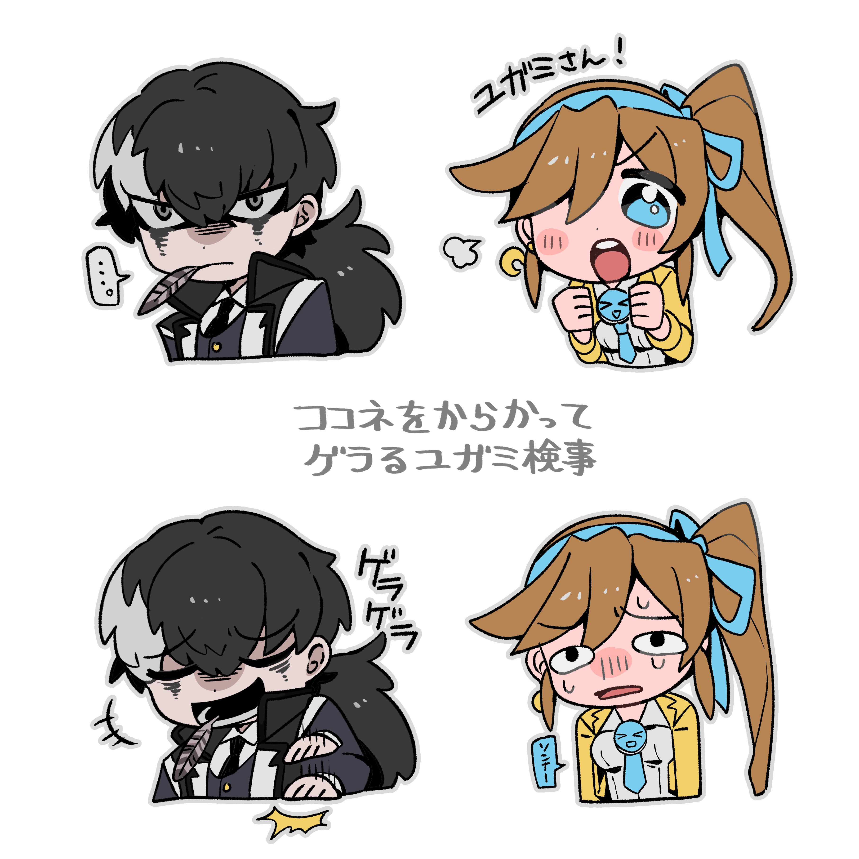 kanade (kanade 3344), toyama kasumi, bang dream!, absurdres, commentary request, highres, translated, 1girl, blush, brown hair, cone hair bun, donut, eating, food, hair bun, hair ornament, holding, holding food, medium hair, purple eyes, request inset, sidelocks, simple background, solo, star (symbol), star hair ornament, tongue, tongue out, upper body, white background