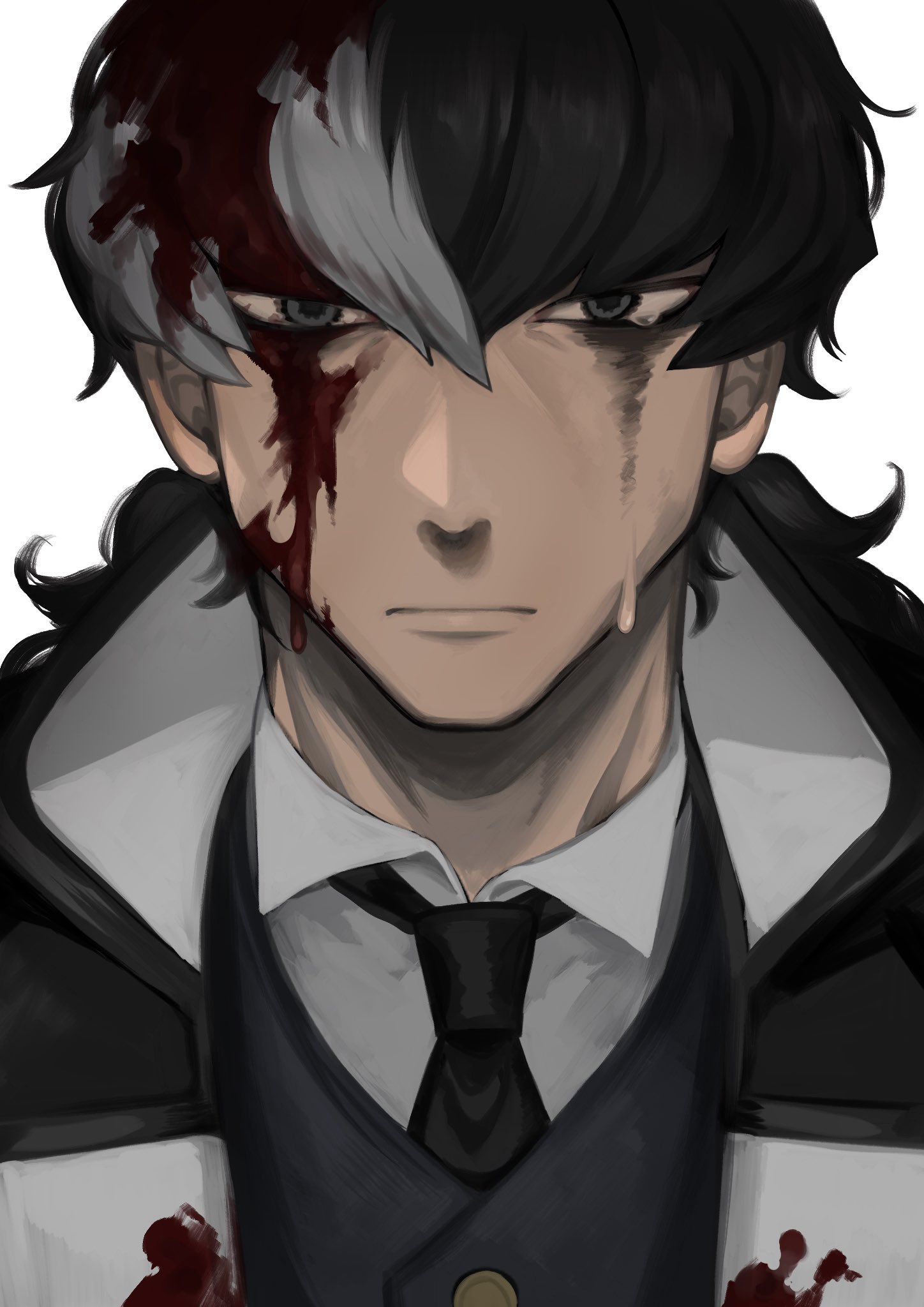 1boyblack eyesblack hairblack jacketblack necktiebloodblood in hairblood on clothesblood on faceclosed mouthcollared shirtgrey hairhair between eyesjacketlooking at viewermale focusmulticolored hairnecktieshirtsoloteardroptwo-tone hairwhite background