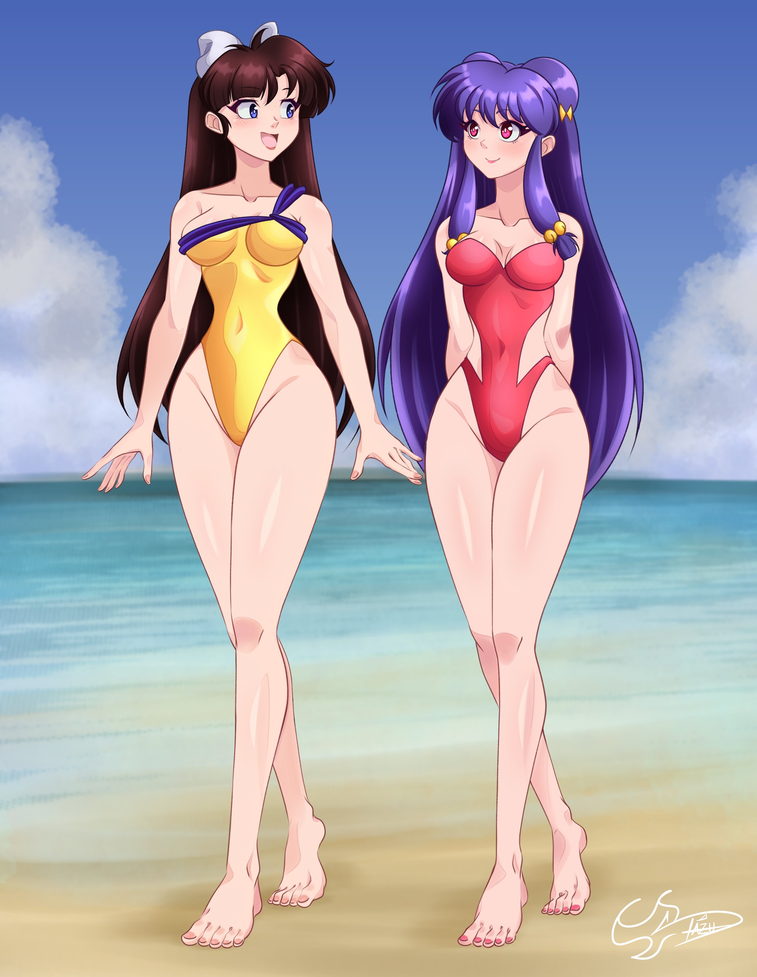 2girlsarms behind backartist namebare armsbare hipsbare legsbare shouldersbarefootbeachbellblue eyesblue skybowbreastsbreasts apartbrown hairclothing cutoutcloudcollarbonecovered navelcurvydouble bunfull bodyhair bellhair bowhair bunhair ornamenthighleghighleg one-piece swimsuitlegslong hairlooking at anothermedium breastsmultiple girlsoceanone-piece swimsuitopen handsopen mouthoutdoorspink eyespink nailspurple hairred one-piece swimsuitshiny skinside cutoutsidelockssignaturesingle strapskysmilestandingstraplessstrapless one-piece swimsuitswimsuittoenailstoesvery long hairwalkingwhite bowwide hipsyellow one-piece swimsuit