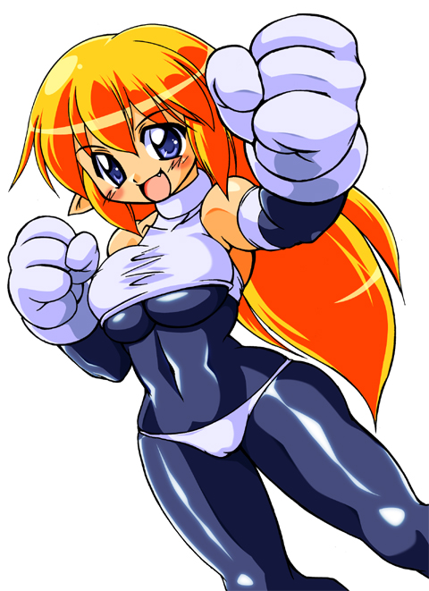 :d1girlblue bodysuitblue eyesblushbodysuitbreastsfangfemale focusgloveslarge breastslong hairopen mouthorange hairsmilesolo