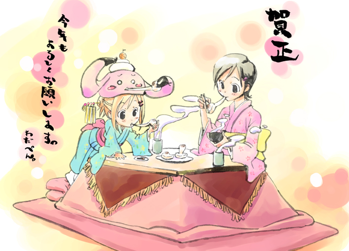 2girlseatingjapanese clotheskagami mochikimonokotatsukotoyoromultiple girlsnew yearobject on headtablezouni soup