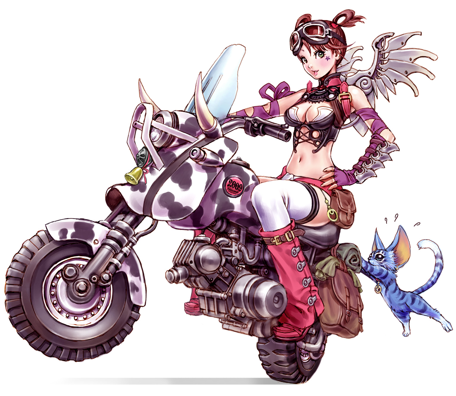 1girlanimal printbagbellbootsbreastsbrown hairbustiercatcleavagecow printcrop topelbow glovesfacial markfemale focusfingerless glovesglovesgogglesgreen eyeshand on own hiphip focuslarge breastslingerielipsloose socksmidriffmotor vehiclemotorcyclenavelpink bootssatchelshort hairshort twintailssockssolostar (symbol)star facial markstrapsweatdropthighhighsturtlenecktwintailsunderwearwheeliewhite sockswings
