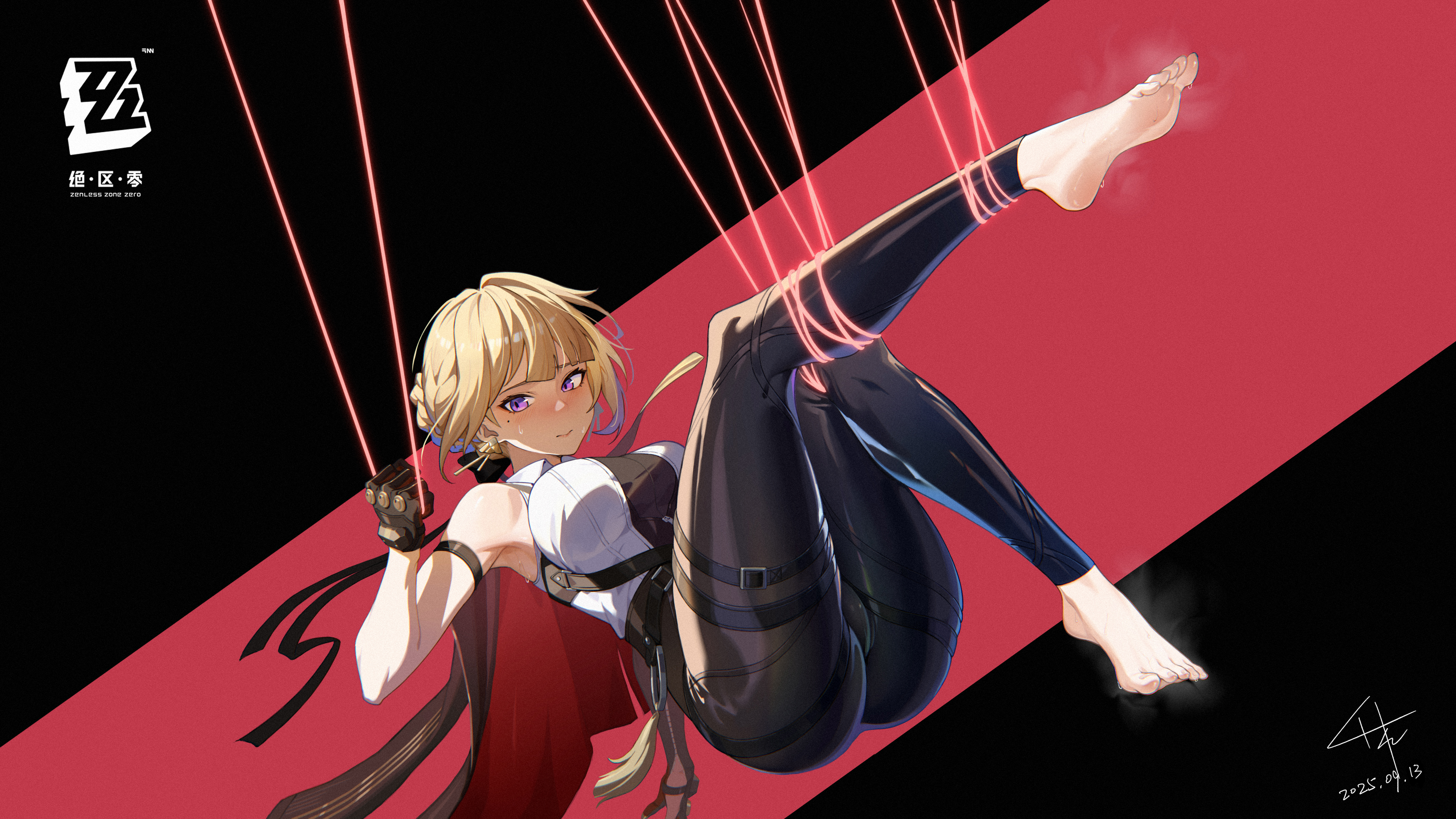 wayanfa, lydia macarthur, original, absurdres, commission, commissioner upload, highres, non-web source, 1girl, animal print, arm belt, belt, belt collar, blonde hair, boots, breasts, cat print, collar, eyelashes, eyepatch, gloves, grey eyes, hair over one eye, hair ribbon, hand in own hair, hood, hood down, hoodie, large breasts, long bangs, long hair, long sleeves, looking at viewer, muscular, muscular female, ponytail, ribbon, scar, shorts, simple background, solo, thighhighs, thighs
