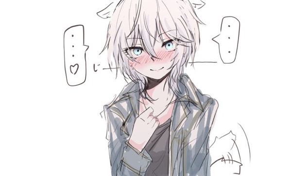 1boyafterimageanimal ear fluffanimal earsblack shirtblue eyesblushclosed mouthgrey hairgrey jackethair between eyeshand upheartjacketkemonomimi modelooking at viewernose blushopen clothesopen jacketshirtsimple backgroundsketchsmilespoken ellipsisspoken hearttailtail waggingupper bodywhite background