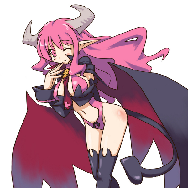 1girlbootsbreastsdemon girlfemale focushornslong hairnecktiepink eyespink hairpointy earssolotailthigh bootsthighhighswings