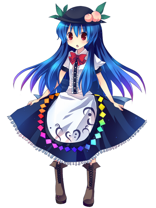 1girlblue hairfemale focusfoodfruitfull bodyhatleaflong hairpeachred eyessimple backgroundsolo