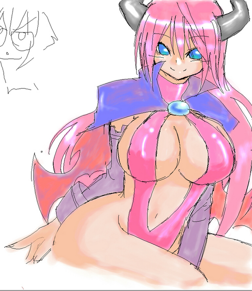1girlbreastsdemon girlfemale focushornsleotardlong hairpartially coloredpink hairpointy earssolotailwhite backgroundwings