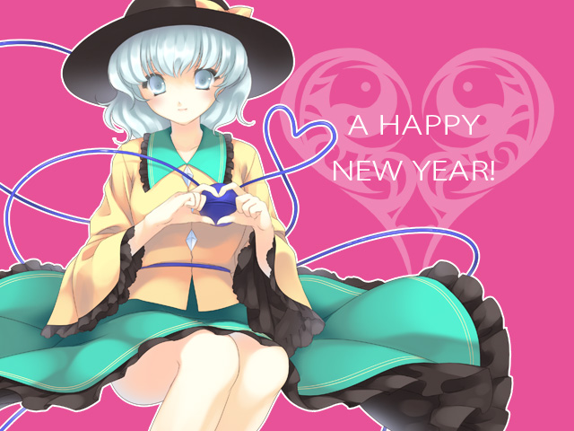 1girlblue eyesfemale focusfour-finger heart handshatheartheart handsheart of stringnew yearsimple backgroundsittingskirtsmilesolothird eye