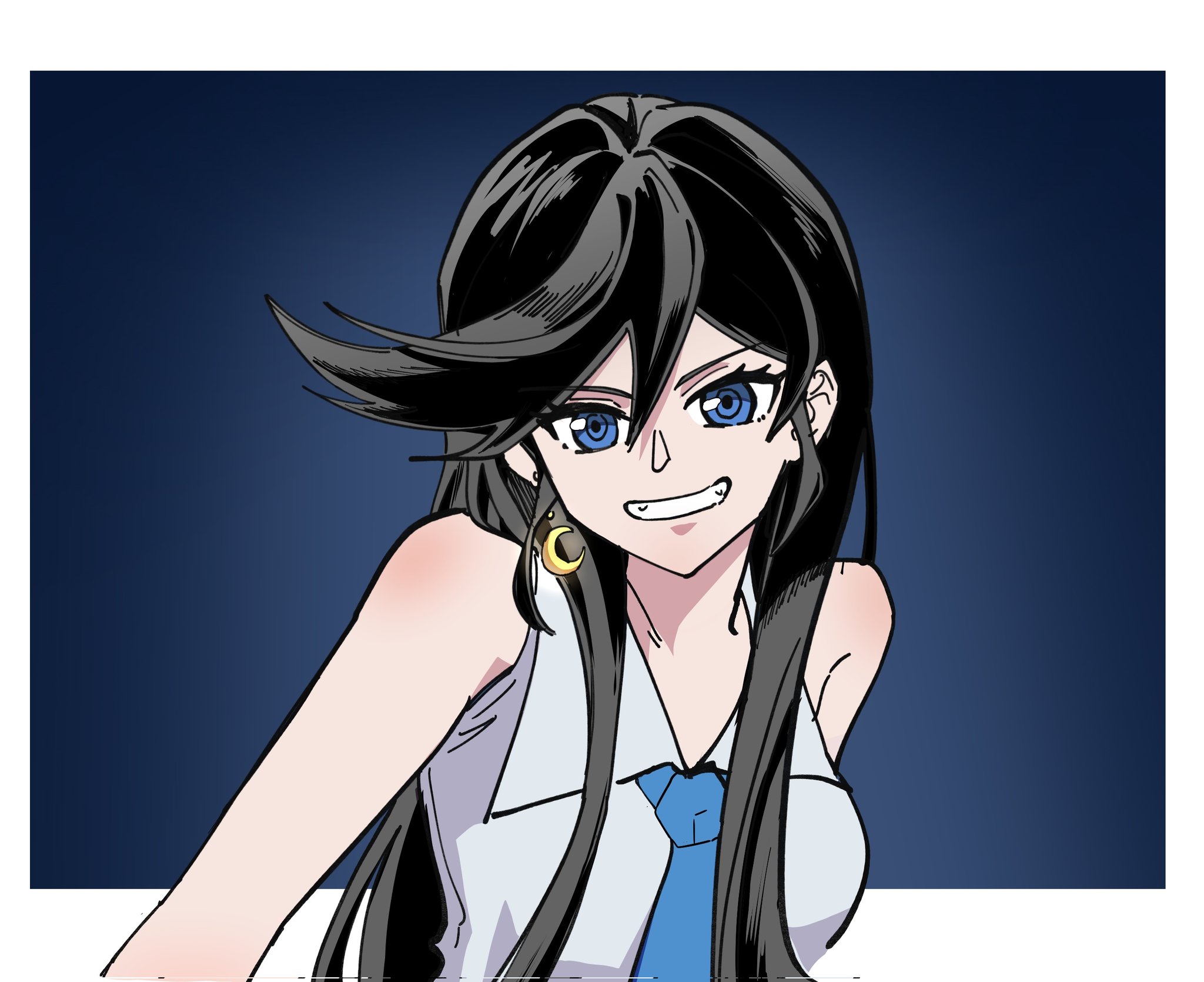 1girlalternate hair colorbare shouldersblack hairblue eyesblue necktiecollared shirtcrescentcrescent earringsearringshair between eyeshair downjewelrylooking at viewernecktieshirtsingle earringsleevelesssleeveless shirtsmilesoloteethupper bodywhite shirt