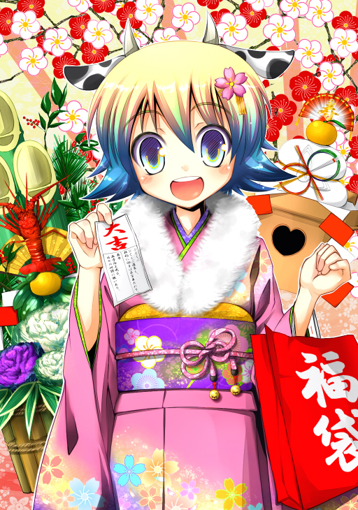 1girlanimal earscow earsfemale focusjapanese clotheskadomatsukagami mochikimonomulticolored hairnew yearomikujisolotwo-tone hair