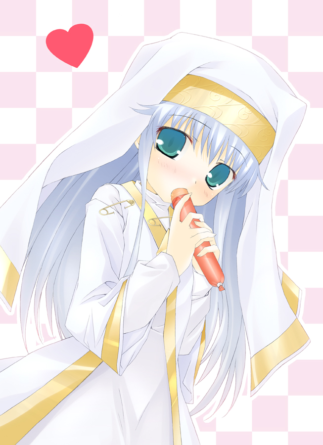 00s1girlblue eyesblue hairblushcheckered backgroundeatingfemale focusfoodgreen eyesheartlong hairmatching hair/eyessausagesexually suggestivesolo