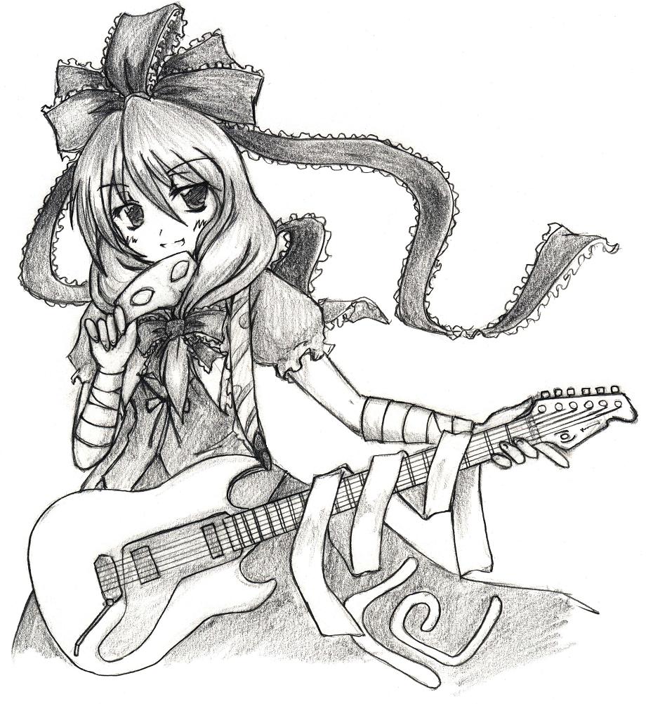 1girlarm ribbonfemale focusfront ponytailgreyscaleguitarhair ribboninstrumentmaskmonochromeribbonsketchsmirksolo