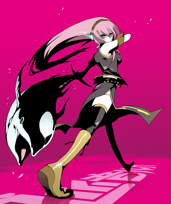 armletblack thighhighsbootsbrown bootscharacter namefishglowinghigh contrastjewelryknee bootslong hairlooking backpink backgroundpink hairthighhighstunawalking