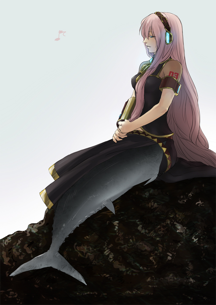 1girlblue eyesfemale focushands on lapheadphoneslong hairlooking to the sidemermaidmonster girlmusical notepink hairrocksittingsolotuna
