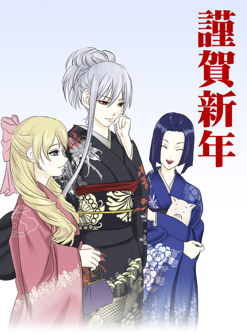 kurage 67, scaramouche (genshin impact), wanderer (genshin impact), genshin impact, absurdres, highres, 1boy, anemo symbol (genshin impact), arm at side, armor, black bodysuit, black bridal gauntlets, black hair, blue cape, blue gemstone, blue hat, blue kimono, blue sky, blue sleeves, blunt ends, bodysuit, border, bridal gauntlets, cape, choppy bangs, cloud, cloudy sky, eyeliner, eyeshadow, feathers, fingernails, gem, gold, gold ring, hand up, hat, japanese armor, japanese clothes, jingasa, juban, kimono, kote, kurokote, layered sleeves, looking at viewer, lower teeth only, makeup, male focus, mandarin collar, middle ring, open clothes, open hand, open kimono, open mouth, pom pom (clothes), purple eyes, purple rope, red eyeliner, red eyeshadow, rope, short sleeves, shoulder peek, sky, smile, solo, teeth, tsurime, twitter username, upper body, vision (genshin impact), white border, white kimono, white sleeves, white trim, yellow feathers