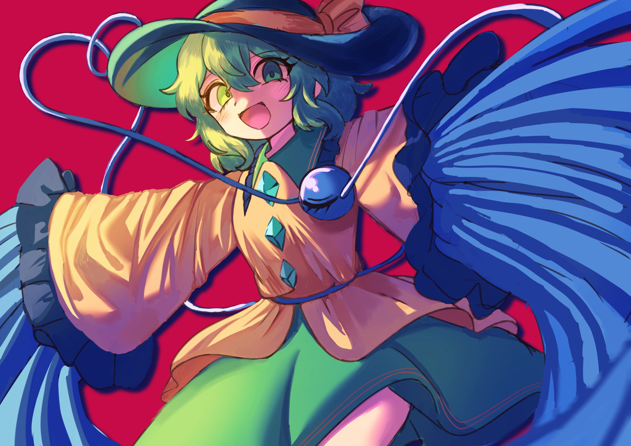 kabutoyama, remilia scarlet, touhou, 1girl, blue hair, blush, dress, female focus, hands on own head, hat, hat ribbon, open mouth, puffy sleeves, red eyes, ribbon, short hair, solo, wings