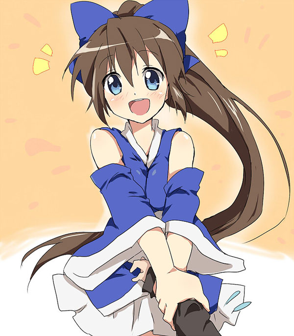 araki shin, otonashi saya, blood+, 00s, 1girl, ao dai, black hair, blue dress, breasts, dress, female focus, long sleeves, red eyes, short hair, solo