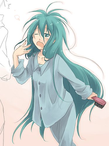 alternate hairstylegreen eyesgreen hairhair brushhair downlong hairmessy hairone eye closedopen mouthpajamassleepysolowinkyawning