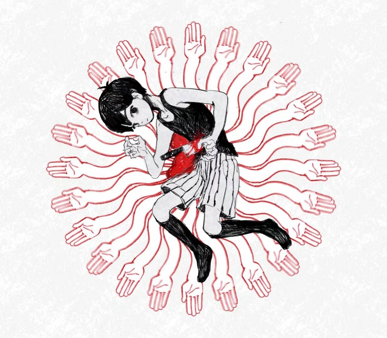 1boyantenna hairbare armsbare shouldersbloodblood splatterbloody knifeclosed mouthcollarboneempty eyesexpressionlessfull bodygrey backgroundgreyscalehand uphigh contrastknee upkneehighsknifelooking at viewermale focusmonochromeno pupilsno shoesshort hairshortssimple backgroundsockssolospot colorstabstriped clothesstriped shortstank topvertical-striped clothesvertical-striped shortsvery short hair