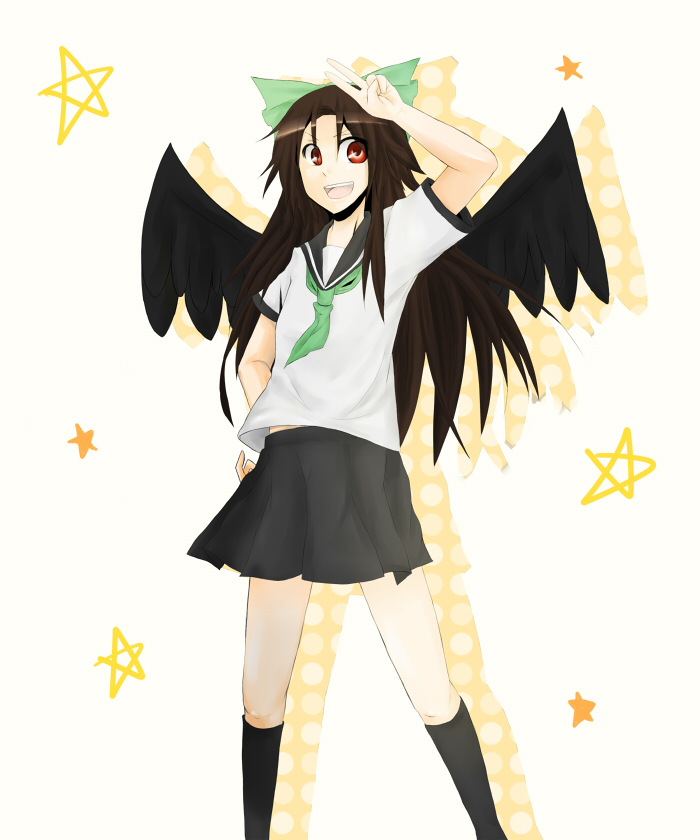 1girlalternate costumeblack hairbowfemale focushair bowlong hairschool uniformserafukuskirtsolostar (symbol)vwhite backgroundwings