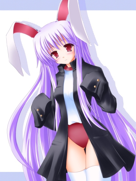 1girlalternate costumeanimal earsburumacoatfemale focusgym uniformlong hairmzk 08oversized clothespurple hairrabbit earsred eyessolovery long hairwhite background