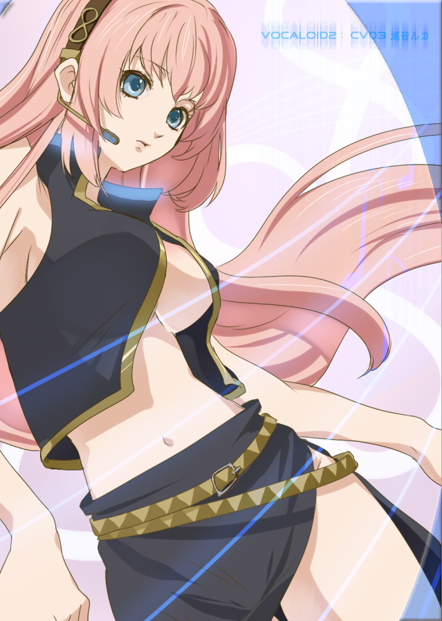 1girlblue eyesbreastsfemale focusheadsetlong hairmidriffopen clothesopen shirtpink hairshirtsolo