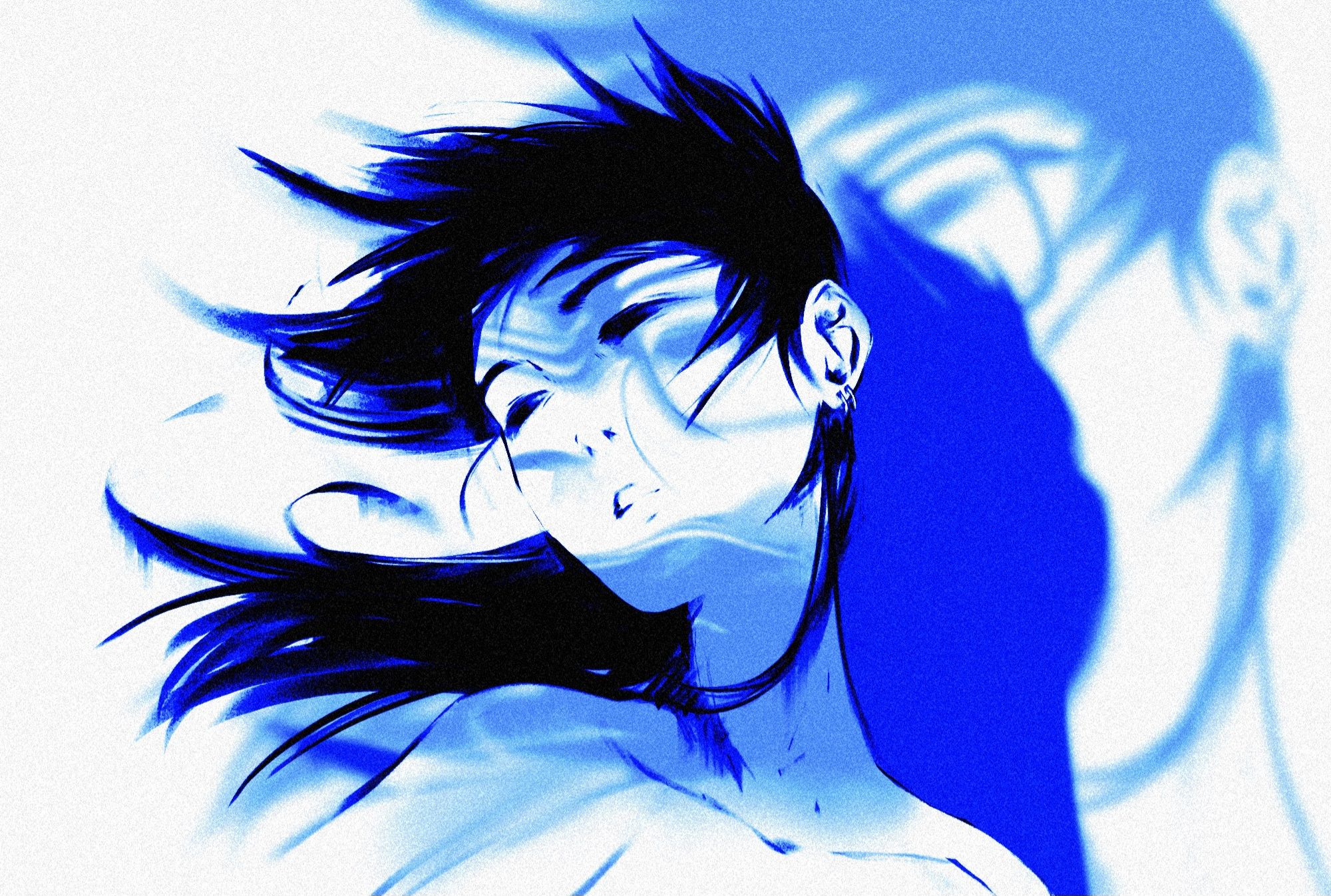 1girlblack haircpn86457earringsfloating hairjewelrylong hairmonochromeparted lipssolozoom layer