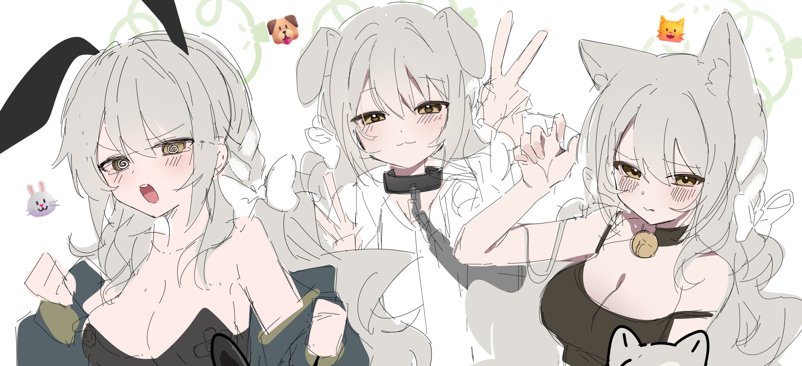 1girlanimal earsbellblack collarblack leotardblushbowbreastscat earscleavageclosed mouthcollardog earsdouble vfake animal earsgrey hairhair bowhalolarge breastsleashleotardlong hairlooking at viewermultiple viewsneck bellopen mouthplayboy bunnyrabbit earssimple backgroundsketchvwhite background
