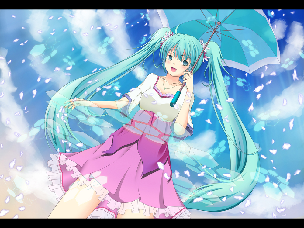 1girlaqua eyesaqua hairclouddaydressfemale focusletterboxedlight rayslong hairskysolosunbeamsunlighttwintailsumbrella