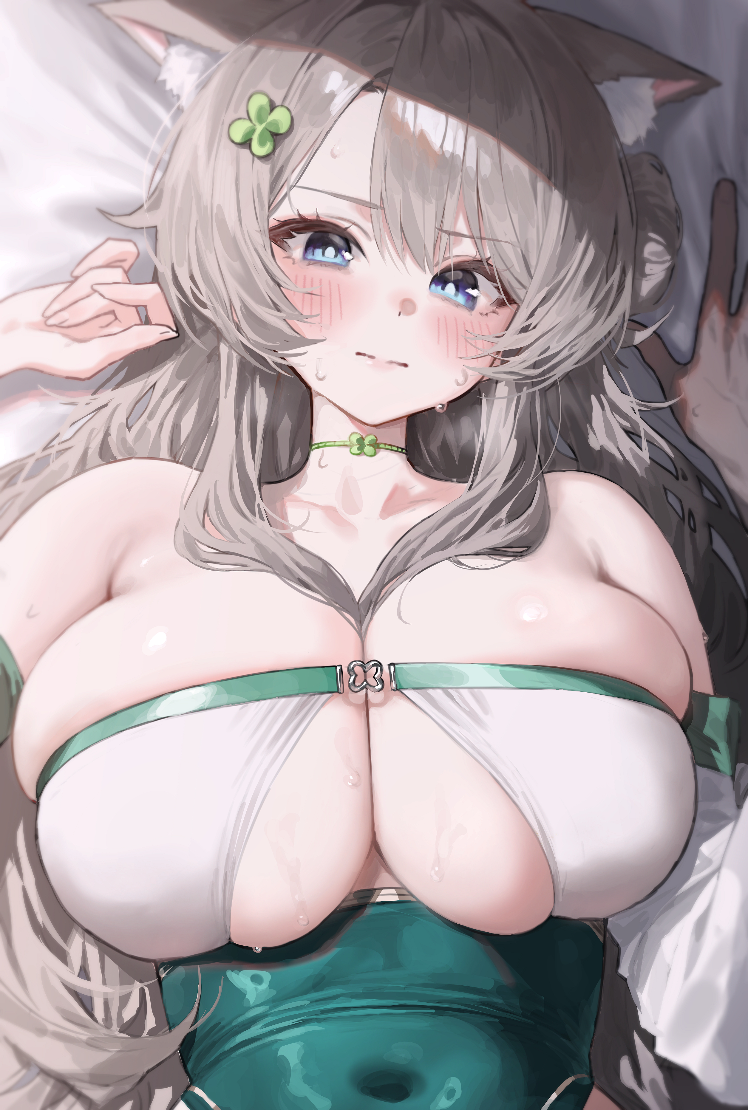 1girlanimal ear fluffanimal earsasymmetrical bangsbare shouldersblue eyesblushbreastsbrown hairchokercleavageclosed mouthclothing cutoutclover chokerclover hair ornamentcovered naveldetached sleevesembarrassedeyelashesfour-leaf clover hair ornamentgreen chokerhair bunhair ornamentlarge breastslong hairlooking at viewerlyingon backparted bangspinnedpovsidelockssingle side bunskindentationsolo focusunderboobunderboob cutoutupper body