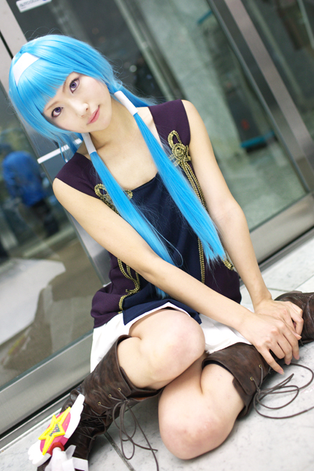 1girlblack eyesblue hairbootscosplayfemale focushair tubesnagi (cosplay)on floorsittingsleevelesssolo