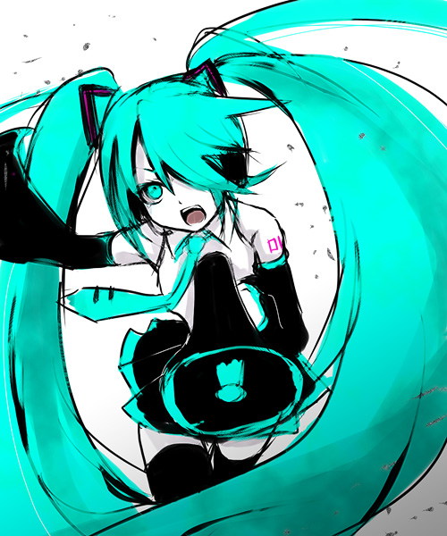 1girlaqua eyesaqua hairdetached sleevesfemale focushair over one eyeheadsetlong hairmegaphonenecktieskirtsolothighhighstwintailsvery long hair