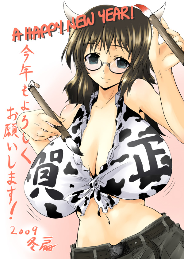 00s1girl2009animal printblushbreastsbrown haircalligraphy brushcleavagecow printfemale focusfront-tie topglassesgreen eyeshornshuge breastslong hairmidriffnew yearpaintbrushsmilesolo