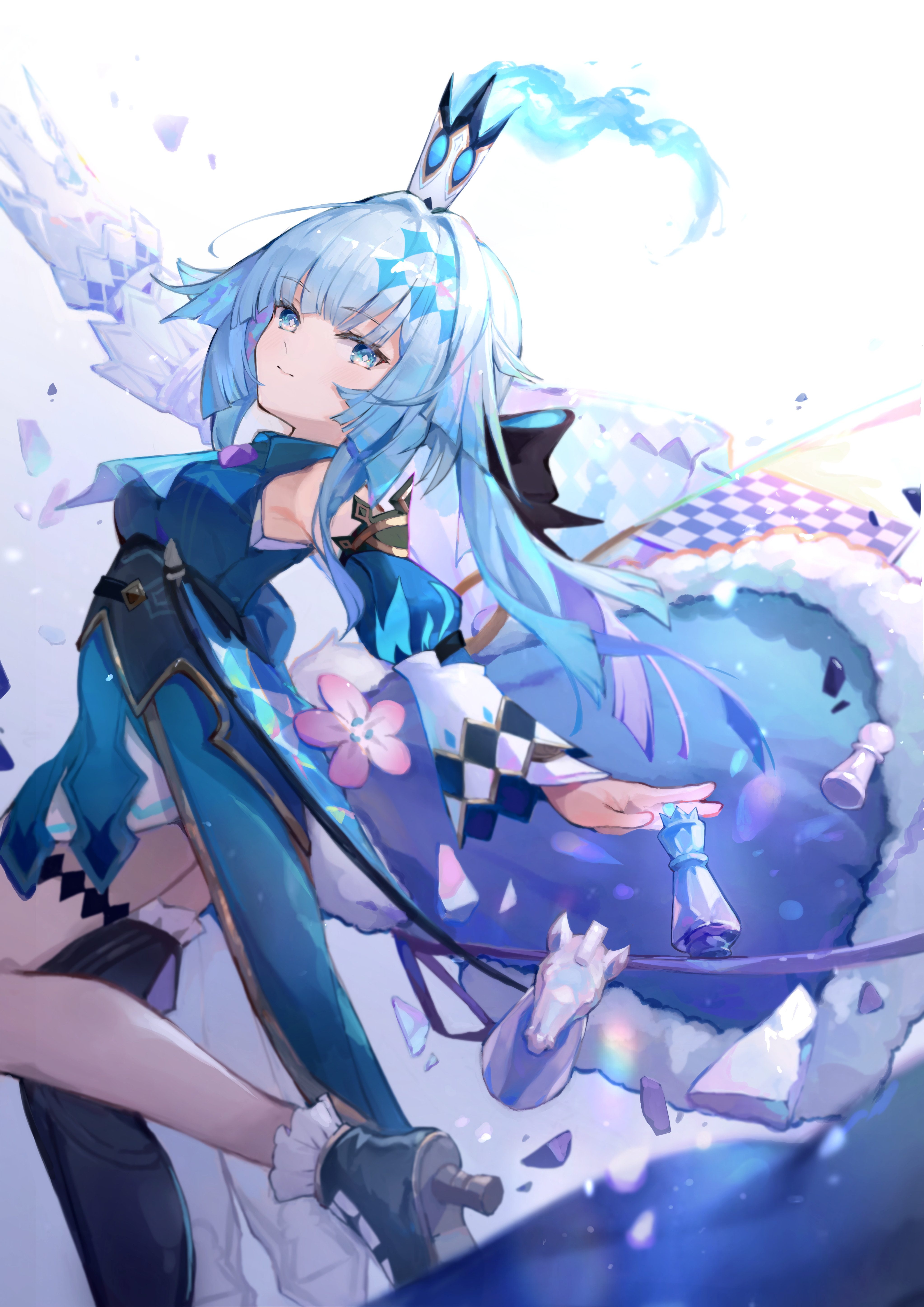 1girlblack thighhighsblue eyesblue hairblue shirtboard gamebreastschesschess piececlosed mouthcollared shirtcrowndetached sleeveshair ornamenthigh heelslong hairlong sleeveslooking at viewermedium breastsmulticolored hairpumpsshirtsingle thighhighsleevelesssleeveless shirtsmilesolothighhighsvery long hairwhite hair