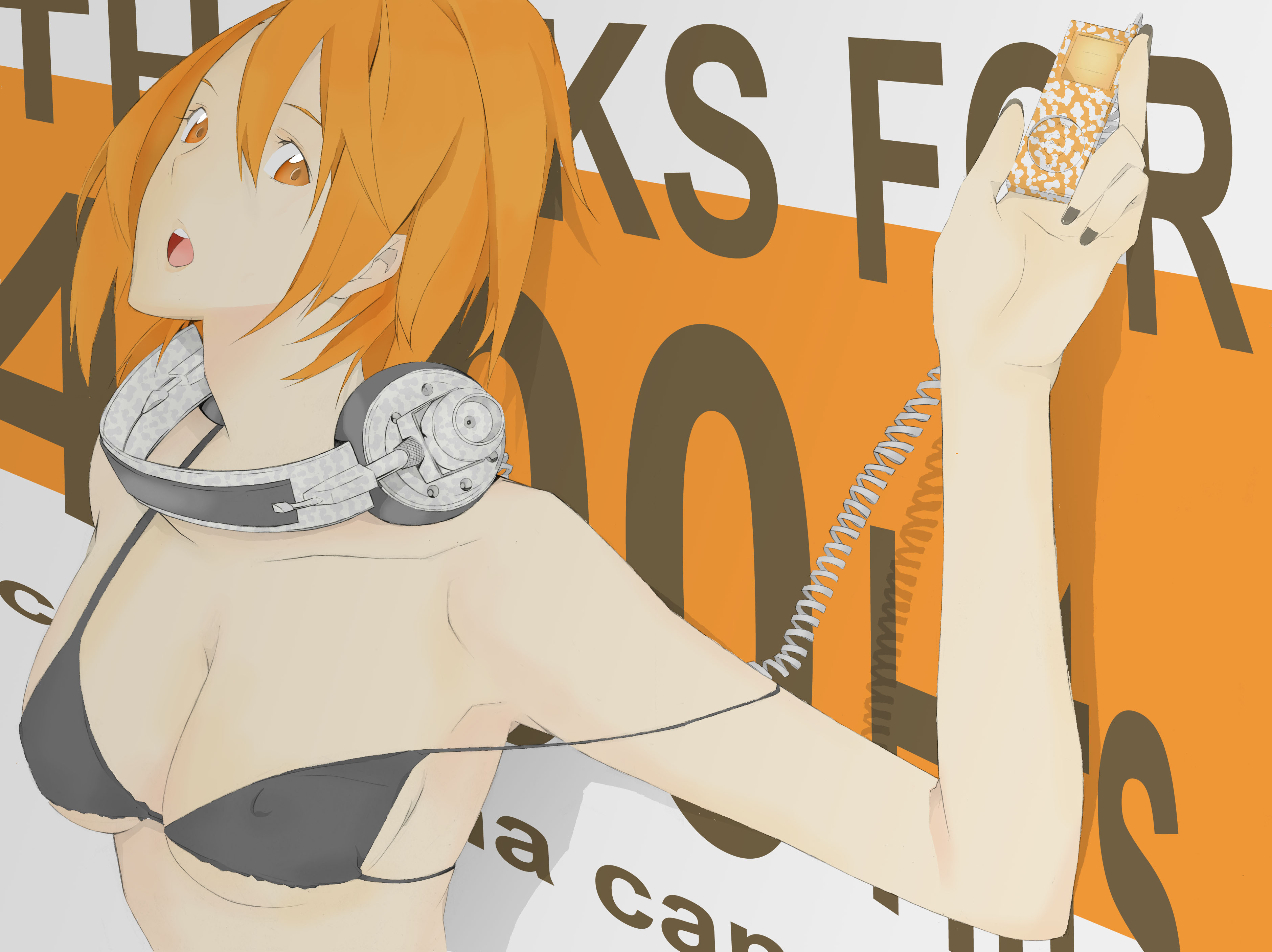 bikiniblack bikinidigital media playerheadphonesheadphones around neckipodnail polishorange eyesorange hairshort hairsolostrap slipswimsuit