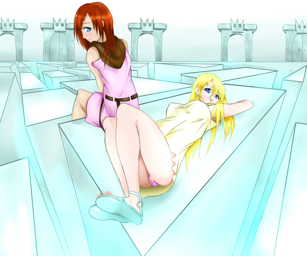 arcueid brunestud, tsukihime, 00s, 1girl, blonde hair, breasts, female focus, large breasts, one eye closed, open clothes, open shirt, red eyes, shirt, solo, wink, yawning