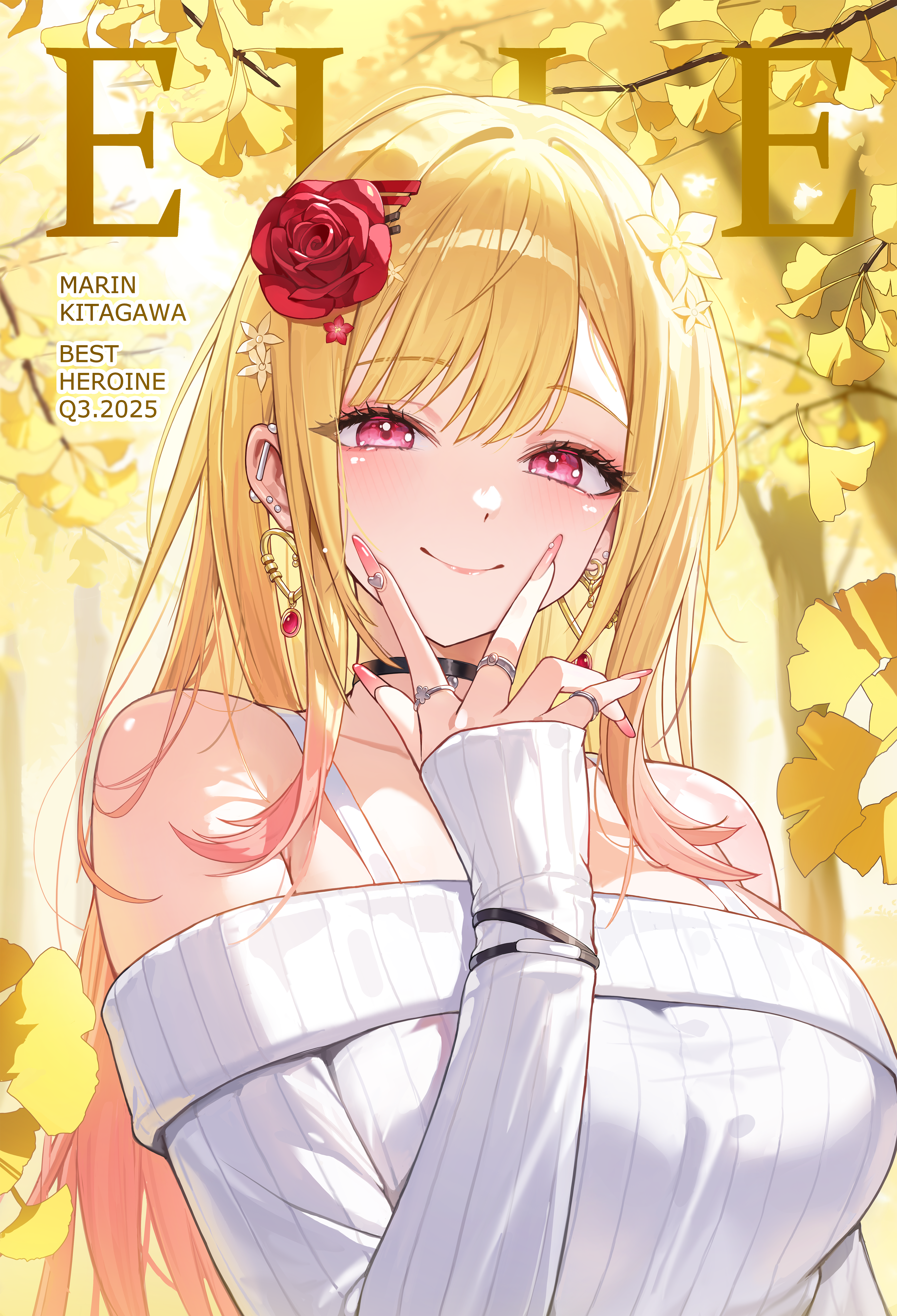 1girlbarbell piercingblack chokerblonde hairblushbreastscharacter namechokerear piercingfingernailsflowerginkgo leafginkgo treehair flowerhair ornamentholdingholding leafindustrial piercingjewelrylarge breastsleaflong fingernailslong hairlong sleeveslooking at viewermultiple ringsnail polishoff shoulderoff-shoulder sweaterpiercingpink nailsred eyesred flowerred roseringrosesleeves past wristssmilesolosweaterupper bodywhite sweater