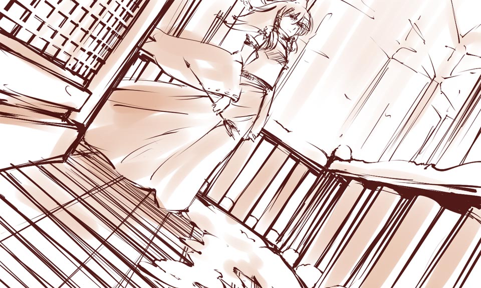 1girlarrow (projectile)bowdetached sleevesdutch anglefemale focushair bowhair tubesmonochromeskirtskirt setsnowsoloveranda