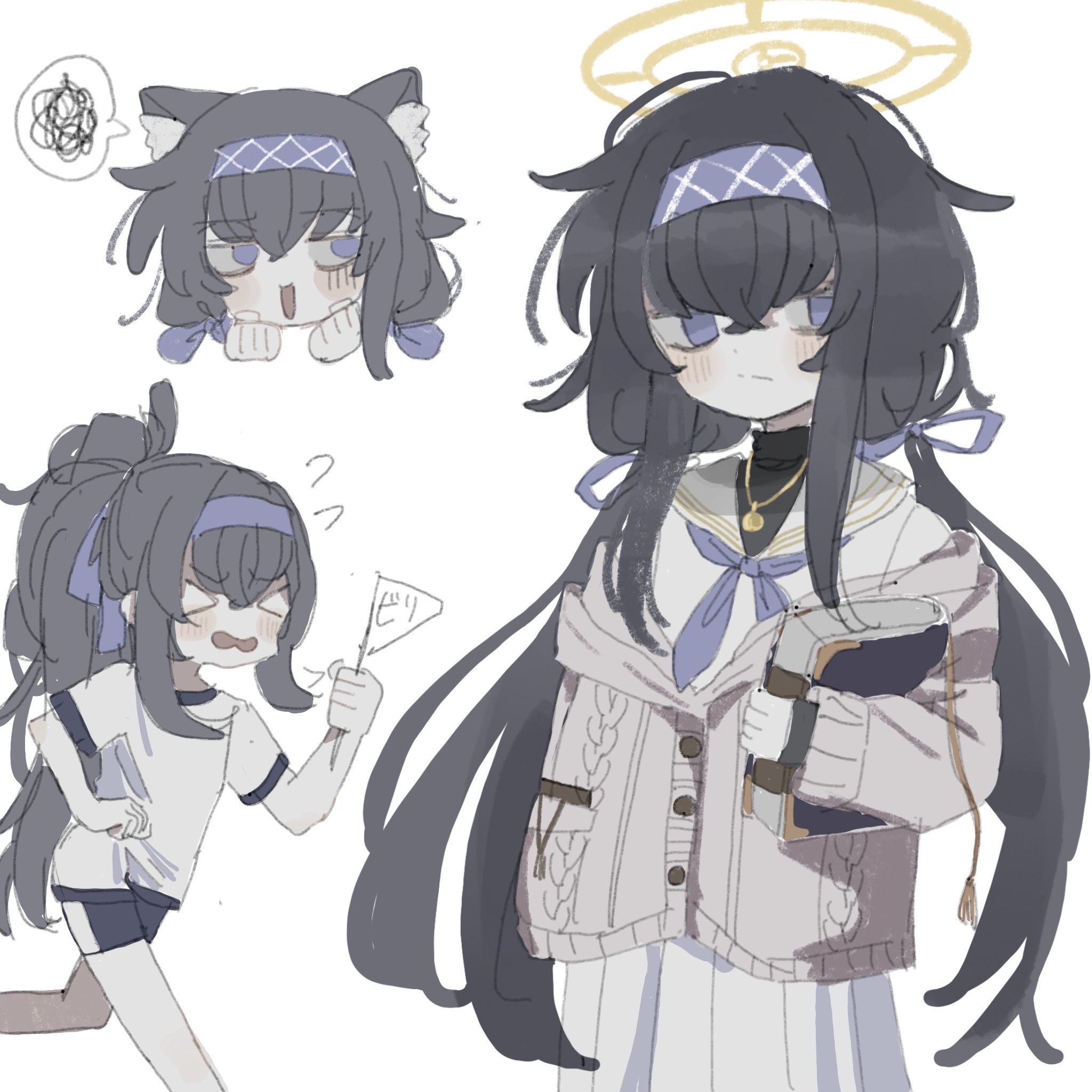1boy1girlanimal earsbags under eyesblack hairblue hairbandblue neckerchiefblue ribbonblushbookbrown cardigancardigancat earsclosed mouthcrossed bangsflaggrey cardigangym uniformhair between eyeshair ribbonhairbandhaloholdingholding bookholding flagjewelrykawaii nekocatlong hairlong sleeveslow twintailsmultiple viewsneckerchiefnecklaceopen mouthpleated skirtponytailpurple neckerchiefribbonrunningsailor collarschool uniformserafukushirtshort sleevesshortssimple backgroundskirtspoken squigglesquiggleturtlenecktwintailsundershirtvery long hairwhite backgroundwhite serafukuwhite shirtwhite skirtyellow halo